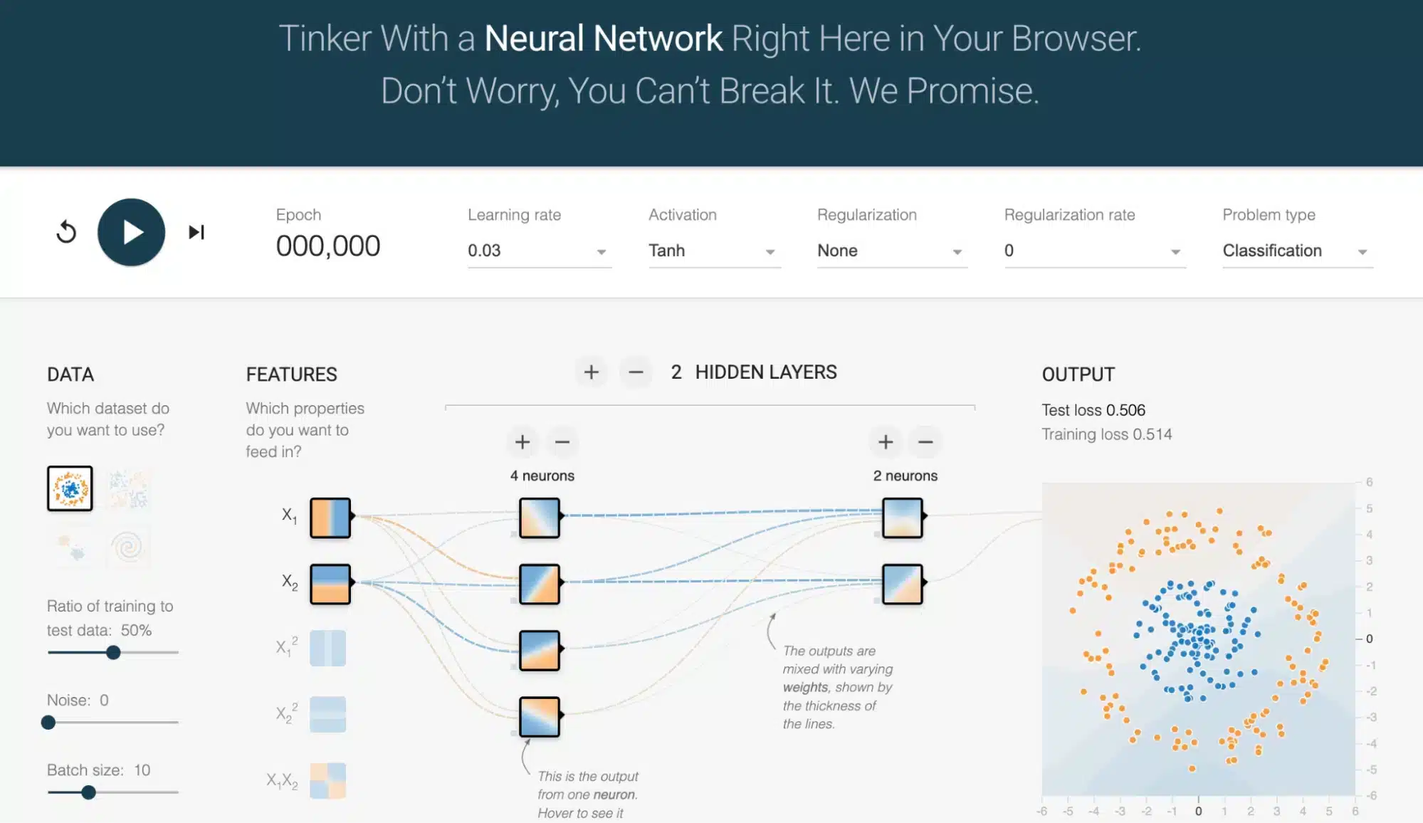 El deep learning fascina tanto como intimida. Entre ecuaciones, GPU y vocabulario esotérico, podrías pensar que se necesita un doctorado en matemáticas para entender su lógica. Sin embargo, el principio es simple: aprender por el ejemplo. Para verlo con tus propios ojos — literalmente — nada supera a TensorFlow Playground.