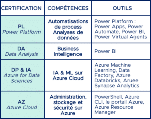 Para demostrar un nivel de experiencia en las herramientas desarrolladas por Microsoft, la empresa estadounidense ha creado certificaciones que validan un nivel de conocimiento en cada herramienta. Estas certificaciones son muy útiles para las empresas, ya que establecen una nomenclatura universal que facilita la formación y el reclutamiento de equipos. Un buen conocimiento de estas herramientas, especialmente Power BI y el cloud de Azure, es esencial para los Data Analysts, Data Engineers y Data Scientists. De hecho, esta competencia representa una ventaja considerable en una solicitud de empleo para un puesto de datos en una empresa que ya haya implementado estas soluciones.