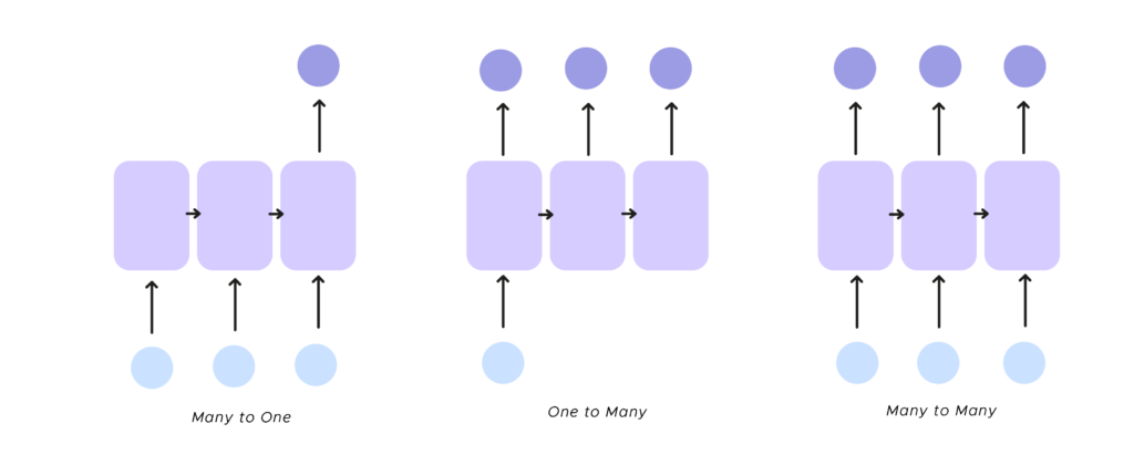 - many to one: tenemos varias entradas y solo hay una salida. Una ilustración de este modo es el análisis de sentimiento en textos. Esto permite identificar un sentimiento a partir de un grupo de palabras, determinar la palabra que falta para terminar la frase recibida en entrada. Para aprender más sobre el análisis de sentimientos, consulta este artículo.