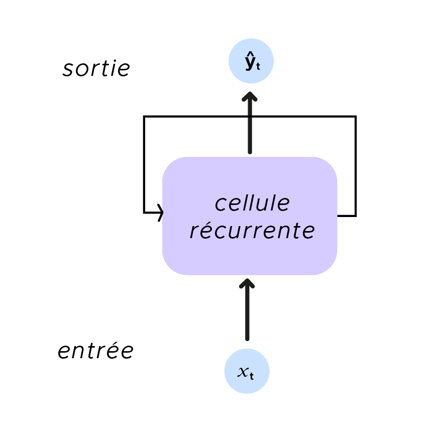 Como hemos indicado antes, estudiamos el movimiento de la pelota de manera local. Queremos tener en cuenta varios instantes del movimiento de la pelota. Si no lo conseguimos con una red neuronal tradicional, con las RNN, todo cambia, porque se introduce el concepto de recurrencia. Efectivamente, observemos la figura de abajo. Añadimos una entrada h_t, llamada estado escondido (hidden state). Ese estado escondido encarna ŷ_t y se da como argumento para la próxima predicción además de la entrada x_t. Efectivamente hemos considerado un conjunto y por tanto, vinculamos las salidas y las entradas sin límite para nuestras muestras de entrada.