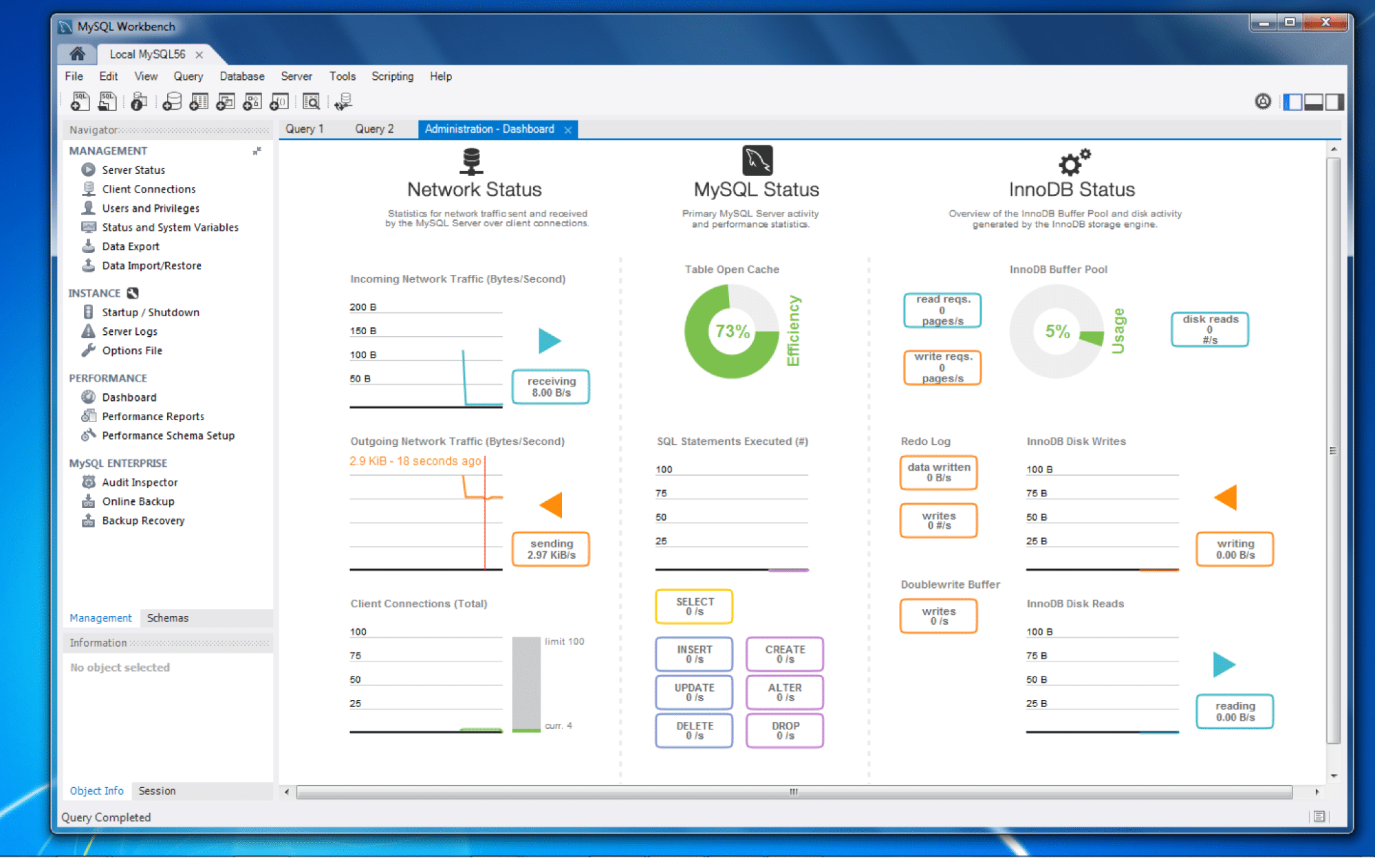 MySQL Workbench abarca herramientas para la gestión del servidor, faculta llevar a cabo la gestión de usuarios, ejecutar copias de seguridad y recuperaciones, así como monitorear el rendimiento del servidor. Los administradores pueden también examinar los datos de auditoría para garantizar la conformidad y la seguridad en las operaciones.