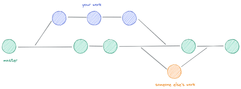 Para asegurar la estabilidad del código, es esencial no contaminar la última versión funcional del mismo. Para ello, GitHub ha introducido el principio de <<ramas>>. Al crear tu repositorio, inicialmente está presente una rama, se trata de la rama <<main>> o <<master>>. El desarrollo de una nueva funcionalidad puede llevar cierto tiempo, y después de finalizarla, hay que probarla. Puedes crear una rama a partir de la rama main (o master) que será una copia exacta de la rama main. Esto te permite aislarte del desarrollo del código funcional. Aquí, un esquema para ayudarte a comprender: