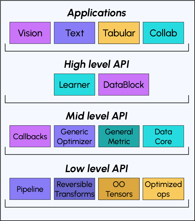 Le diagramme ci-dessus présente l’architecture hiérarchisée de FastAI. Si l’utilisateur souhaite modifier une partie de l’API haut niveau, il n’a pas besoin de connaître en amont le fonctionnement au plus bas niveau du modèle.
