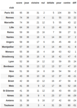 Alors bien sûr Thibault,data scientist chez DataScientest , se plaint de la place de Lyon et du maintien en Ligue 1 de l’ASSE mais c’est un modèle très sommaire…