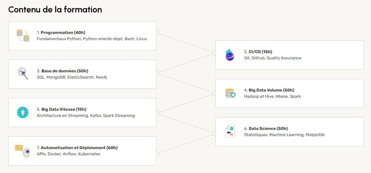 Outre MongoDB, vous apprendrez à manier SQL, ElasticSearch et Neo4j, mais aussi le langage Python, les outils CI/CD tels que Git et GitHub, les solutions de conteneurisation comme Docker et Kubernetes, les techniques de Machine Learning, mais aussi les plateformes Big Data dont Hadoop, Hive, Spark et Kafka.