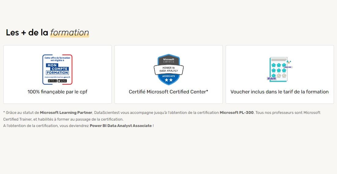 Notre organisme est éligible au CPF pour le financement, et vous pourrez obtenir une certification Microsoft Power BI Data Analyst Associate en passant l’examen PL-300 à la fin du parcours. Découvrez DataScientest !