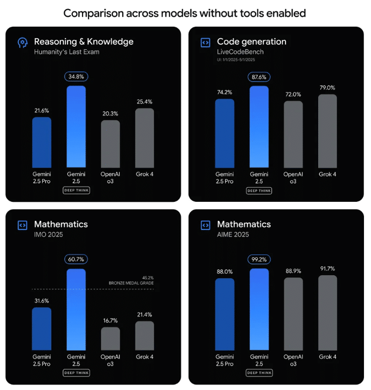 Dans les benchmarks récents, Gemini 2.5 Deep Think surpasse la majorité des modèles grand public. Sur LiveCodeBench 6, un test de génération de code en conditions réelles, il aurait dépassé les modèles actuels d’OpenAI (GPT-4o), Anthropic (Claude 3) et xAI (Grok 4), avec un score dépassant les 87 %. Il brille aussi sur les évaluations en mathématiques, en résolution de problèmes, et sur Humanity’s Last Exam, une référence pour tester les capacités générales d’IA sur des tâches humaines complexes.