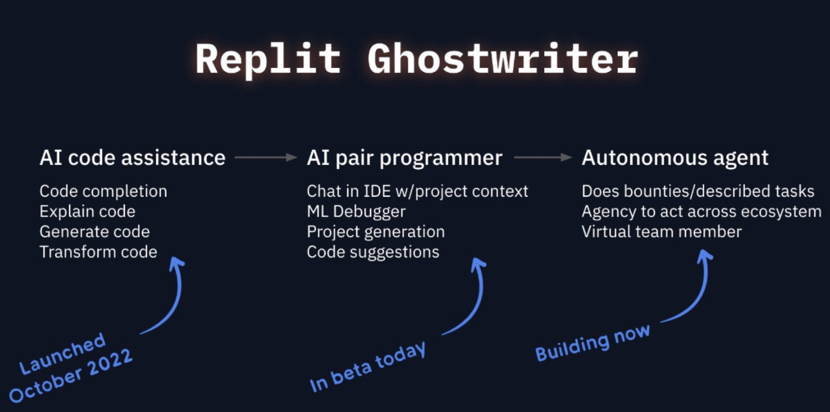 Replit souhaite utiliser les capacités des IA de Google pour améliorer la suggestion des blocs de code, la complétion des programmes et la réponse aux questions des utilisateurs. Replit souhaite se distinguer de Copilot X en fournissant un meilleur système que celui proposé par GitHub. Les différents logiciels de Ghostwriter serviront à accompagner le développeur à chaque étape de création.