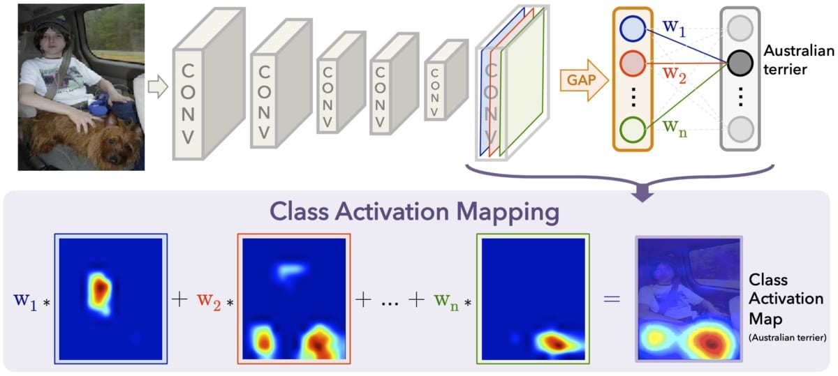 La carte d’activation de classe attribue une importance à chaque position (x, y) dans la dernière couche convolutive en calculant la combinaison linéaire des activations, pondérée par les poids de sortie correspondants pour la classe observée (terrier australien dans l’exemple ci-dessous). La cartographie d’activation de classe résultante est ensuite rééchantillonnée à la taille de l’image d’entrée. Ceci est illustré par la carte thermique (une heatmap) ci-dessous.