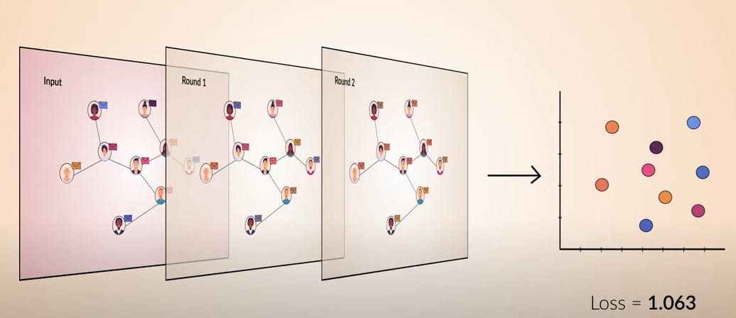 La technique de message passing est répétée à plusieurs reprises pour permettre à chacun des nœuds d’intégrer l’information de ses voisins et ainsi de capturer de plus en plus d’informations sur la structure du graphe. À la fin du processus, chaque nœud contient un node embedding mis à jour qui prend en compte l’ensemble des caractéristiques de ses voisins et des embeddings d’arêtes. Ainsi dans l’embedding space qui correspond à l’espace vectoriel dans lequel les node embeddings sont regroupés, la distance entre les node embeddings dépend de leur similarité. Plus les node embeddings sont similaires, plus ils sont proches.