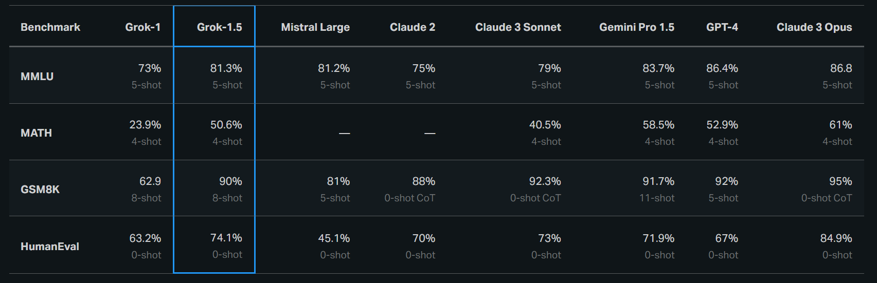 Côté performances, Grok-1.5 montre des résultats impressionnants en mathématiques et en codage. Ayant réalisé plusieurs benchmark dont deux en mathématiques, Grok-1.5 s’en sort avec 50,6% pour le test MATH et 90% sur le test GSM8K. Des résultats qui tendent à se rapprocher des autres LLM d’entreprises comme Google avec Gemini ou OpenAI et le très puissant GPT-4 comme le présente le graphique ci-dessous.