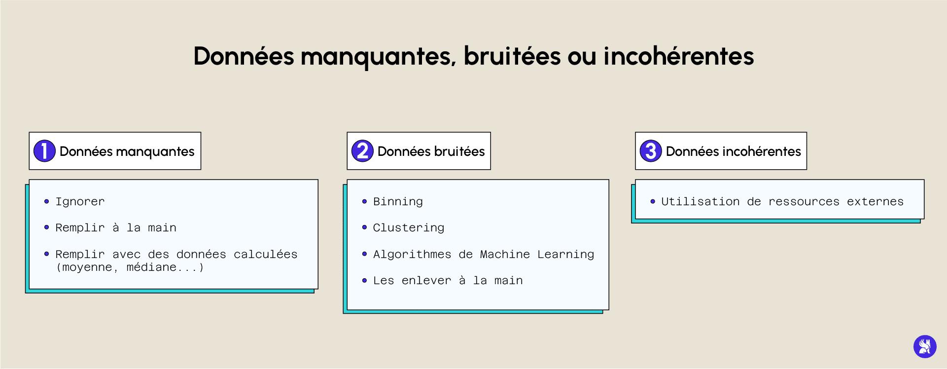 La première étape consiste en un nettoyage des données incorrectes, incomplètes ou manquantes. Il existe plusieurs manières de gérer ces problèmes que nous allons passer en revue.