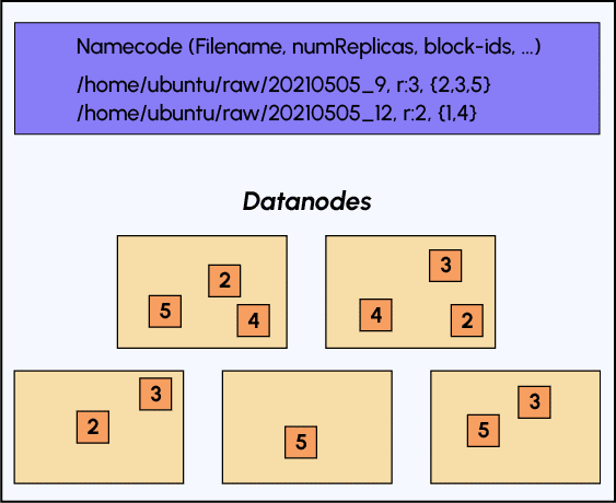 Si on peut le comparer avec un système de fichier classique d’un système d’exploitation, il y cependant des différences au niveau de l’usage et du stockage. En effet, nous sommes dans un cluster de machines, donc comment savoir dans quelle machine du cluster se trouvent nos données ? Vous l’avez sûrement deviné, nous allons employer le Namenode. Pour pouvoir administrer les différentes machines du cluster, le Namenode doit être au courant de l’état de chaque machine, c’est pourquoi nous pouvons y trouver des métadonnées.