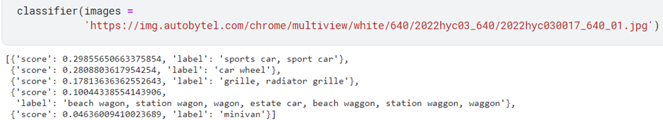 La Pipeline nous aide à le faire en une seule ligne de code. Le modèle propose cinq classifications, chacune associée à une probabilité. La première a le plus grand score, nous pouvons donc prendre « voiture de sport » comme prédiction principale et c’est en effet juste.