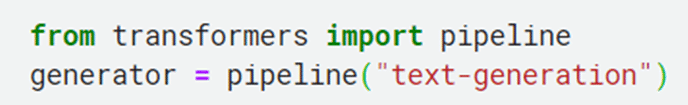 Dans la ligne ci-dessus, nous spécifions le cas d’utilisation que nous souhaitons (génération de texte), et il va automatiquement télécharger le modèle par défaut (dans ce cas GPT-2). Nous pouvons utiliser d’autres versions en spécifiant le paramètre ‘model’.