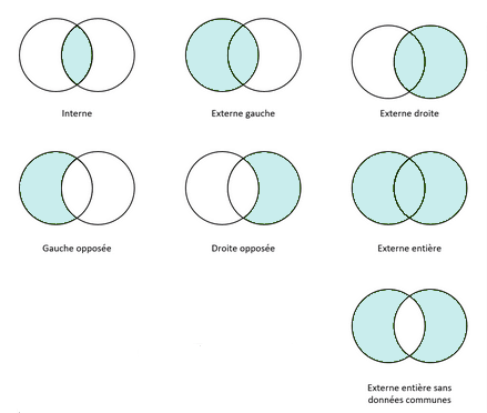 Contrairement aux jointures externes, la jointure interne retourne uniquement les lignes que l’on retrouve dans les deux tableaux A et B. La jointure opposée droite retourne toutes les lignes du tableau B sans correspondance dans le tableau A, et la jointure opposée gauche retourne toutes les lignes du tableau A sans correspondance dans le tableau B.