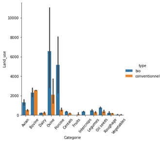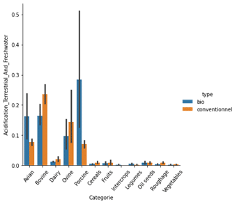 Une représentation de l’impact de la production agricole, selon le type bio ou conventionnel par rapport à certains indicateurs est ensuite proposée dans les graphiques suivants :