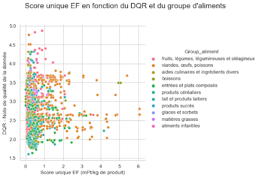 Des variables qualitatives viennent s’ajouter à ce score : groupe d’aliments, sous-groupe d’aliments, nom du produit, saisonnalité, matériau d’emballage, mode de livraison, usage de l’avion ou non, type de préparation, code CIQUAL (table de composition nutritionnelle des aliments) et d’une note de qualité de la donnée DQR (1 excellente à 5 très faible).