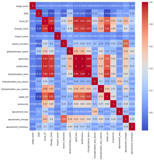 Par exemple, nous observons que les variables particules et acidification ont une corrélation très élevée avec l’eutrophisation des terres (>0.95).