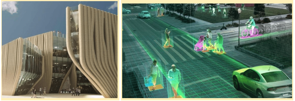 La peinture n’est pas le seul domaine touché par cette frénésie, on retrouve également l’intelligence artificielle dans l’architecture et notamment dans le concept d’architecture dite paramétrique, une architecture basée sur l’exploitation algorithmique de paramètres liant structure et design, ce qui donne naissance à des constructions aux allures irréalistes. Des algorithmes génératifs sont alors de plus en plus introduits dans ce procédé de création et permettent d’envisager de toutes nouvelles formes.