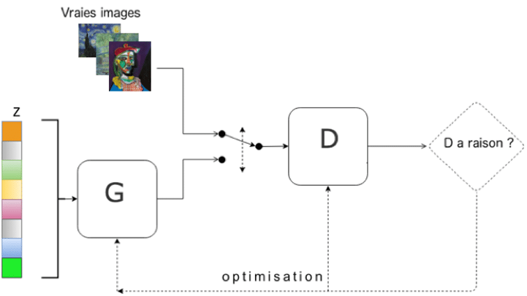 Dans les grandes lignes, il s’agit d’un modèle dont l’apprentissage est en deux temps : un premier réseau de neurones va générer un objet (une image, une vidéo, un son…) et un second réseau se chargera de déterminer si cet objet est généré par le premier ou non, le tout, avec une base de données d’images similaires à celles souhaitées comme ‘combustible’ pour l’algorithme.