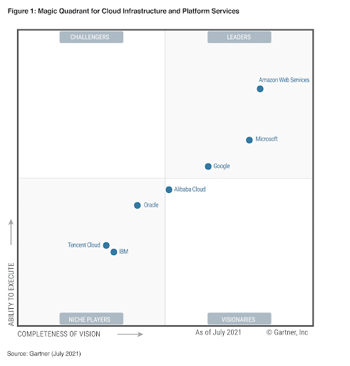 Les trois plus gros leaders du marché du cloud computing sont Amazon Web Services, Microsoft Azure et Google Cloud Platform. Pour analyser brièvement leur place sur ce marché, nous allons porter notre analyse sur le Magic Quadrant de 2021 réalisé par l’entreprise Gartner. Ce cadran magique analyse les sociétés technologiques par secteur et est composé de quatre cases distinctes : Leaders, Visionnaires, Acteurs de niche et Challengers. Nous constatons que les trois plus gros acteurs de ce marché sont situés dans la case en haut à droite. Ils sont donc les leaders sur le secteur des clouds IaaS. Que cela signifie-t-il ? Cela démontre que ces multinationales combinent une excellente vision du marché et ont aussi une très forte capacité à exécuter leurs idées.