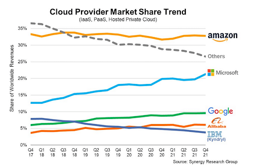 Selon les estimations du Synergy Research Group, près de 65% du marché de cloud IaaS est dominé par trois multinationales au premier trimestre 2022 : Amazon Web Services (AWS) détenant 33% de parts de marché, suivi de près par Microsoft Azure avec 22% et Google Cloud Platform (GCP) avec 10%. Dans son ensemble, ce marché connaît une forte croissance en inscrivant une hausse de 34 % entre le premier trimestre 2021 et le premier trimestre 2022.