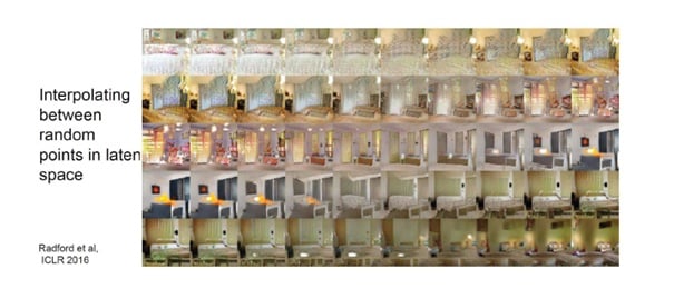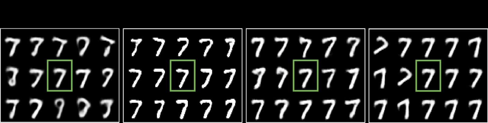 Il y a également une transformation continue entre l’espace latent et la sortie. Si on fait varier continûment un vecteur de l’espace latent, on obtient une transformation continue dans l’espace de sortie.