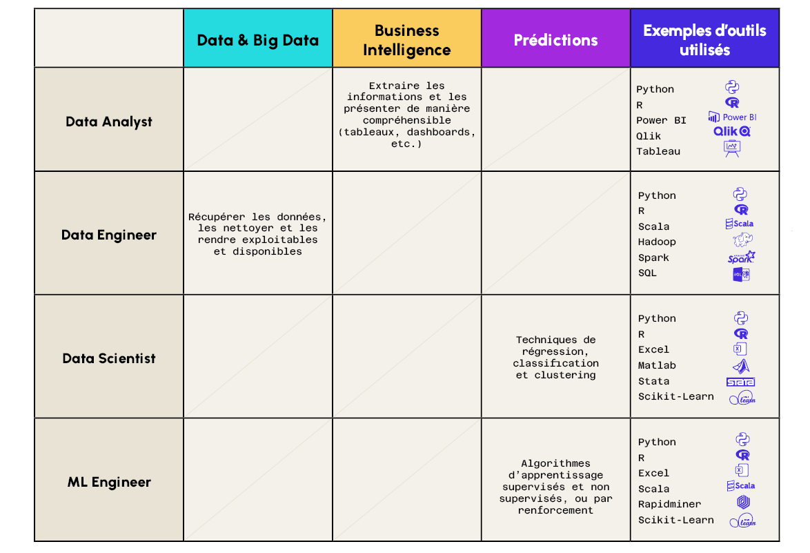 En effet, l’erreur souvent commise est de parler de “Data Scientist” sans distinction pour englober les métiers de la data, alors qu’il s’agit bel et bien de rôles différents.