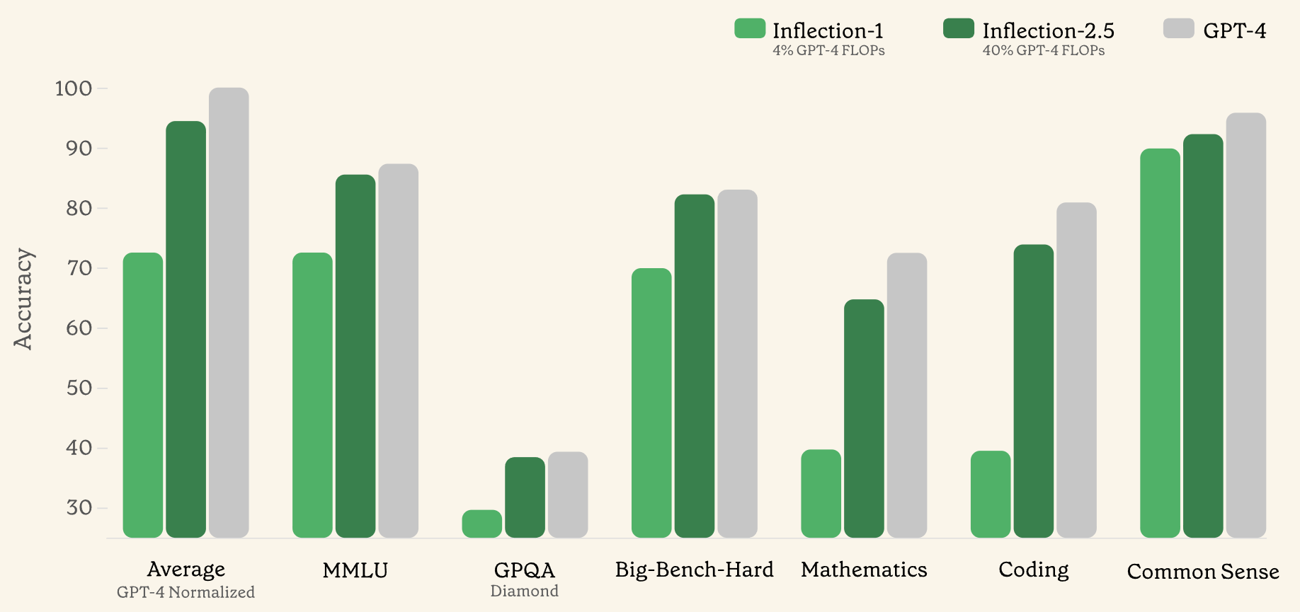 « Nous avons atteint cette étape avec une efficacité incroyable : Inflection-2.5 approche les performances de GPT-4, mais n’utilise que 40 % de la quantité de calcul pour l’entraînement », assure Inflection.
