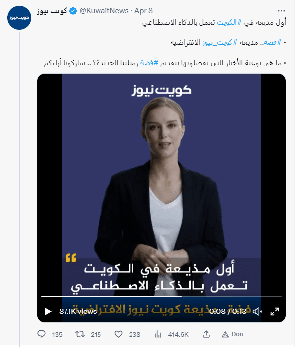 Samedi 8 avril, le média a présenté “Fedha”, une journaliste virtuelle générée par intelligence artificielle, synthesia.io. Blonde aux yeux clairs, vêtu d’une veste noire et d’un t-shirt blanc, elle a fait sa première apparition sur le compte Twitter du site Kuwait News. S’exprimant en arable classique, elle se présente et invite ses spectateurs à lui indiquer les thèmes d’actualité qu’ils préfèrent.