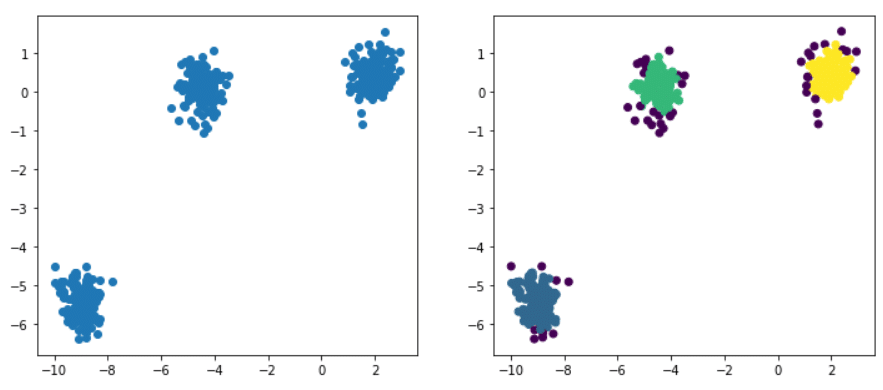 L’entraînement du DBSCAN est facilité avec la librairie Scikit-Learn. Notre jeu de données qui a servi d’exemple se crée facilement avec la fonctionalité make_blobs de Scikit-Learn. Voici comment l’implémenter en code :