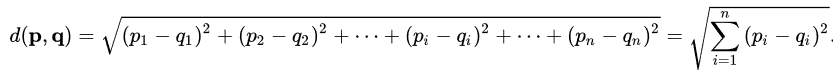 Dans le DBSCAN on utilise généralement la distance euclidienne, soient p = (p1,….,pn) et q = (q1,….,qn) :