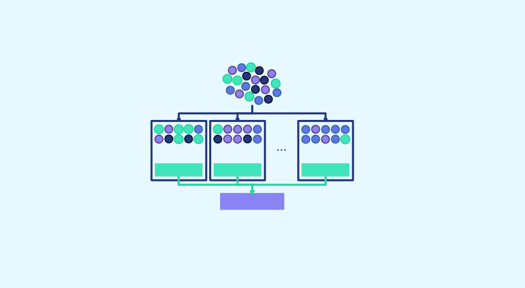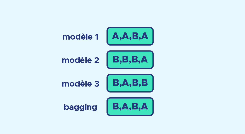 Nous avons besoin d’une unique valeur pour notre problème, c’est là que nous faisons de l’agrégation de données. Pour des modèles de classification, nous allons appliquer un système de vote et pour des modèles de régression, nous allons faire une moyenne de la valeur prédite. En se référant à la citation de départ, nous construisons un modèle final à partir de plusieurs modèles.