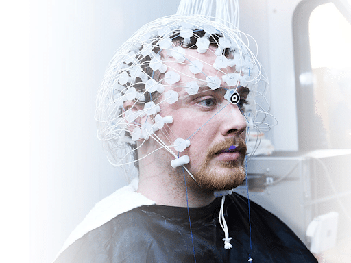 Pour collecter cette donnée, que l’on va analyser par la suite, des électrodes sont disposées sur le crâne. Si l’on mène l’expérience sur vous, vous ressemblerez à peu près à ça :