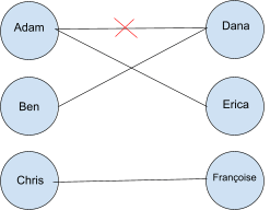 Dans cet exemple, Adam préfère Dana à Erica et Erica à Françoise, Ben préfère Françoise à Erica et Dana et ainsi de suite. Selon l’algorithme de Gale-Shapley, dans notre exemple, Adam et Ben proposent à Dana, et Chris propose à Françoise. Ainsi, Dana choisit celui qu’elle préfère : Ben, Françoise et Chris repartent aussi ensemble. Dans un second tour, Adam propose à Erica (Son deuxième choix). Nous avons donc obtenu trois couples : Adam-Erica, Ben-Dana, et Chris-Françoise. Et cette affectation est stable après deux tours de propositions.