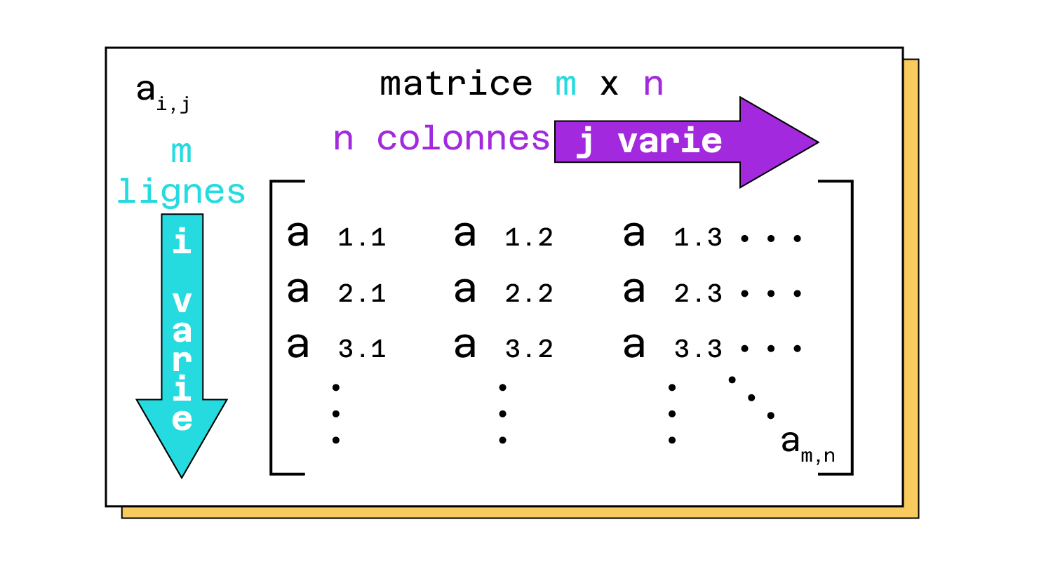 Dans cette matrice, n correspond au nombre de colonnes, m correspond au nombre de lignes, i et j sont les indices qui permettent de retrouver un élément (à la manière des coordonnées).