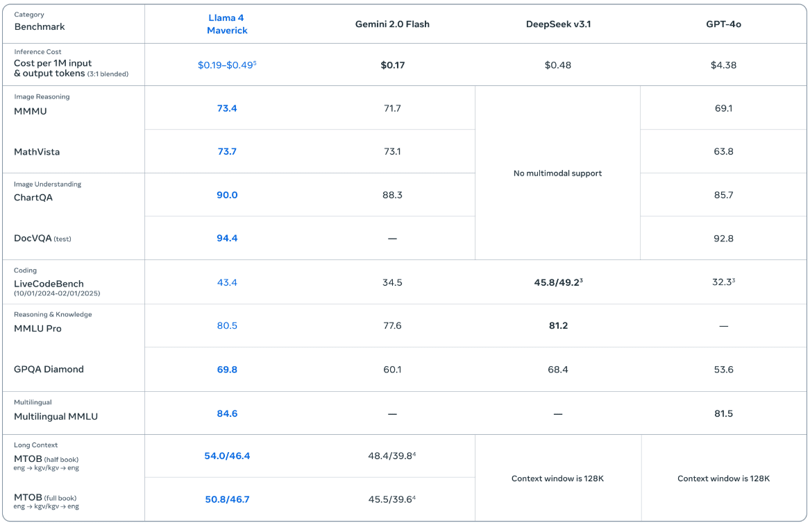 - Maverick, quant à lui, s’attaque aux modèles premium du marché. Meta le positionne comme un rival direct de GPT-4o ou Claude 3, avec des performances solides sur des tâches de raisonnement et de génération de code.