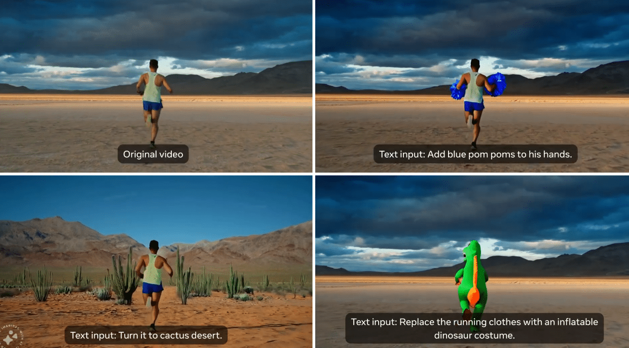 - Édition vidéo : Ce qui rend Movie Gen particulièrement unique, c’est sa capacité à éditer des vidéos déjà existantes en se basant uniquement sur des instructions textuelles. Cela permet de modifier des éléments spécifiques sans toucher au reste de la vidéo.