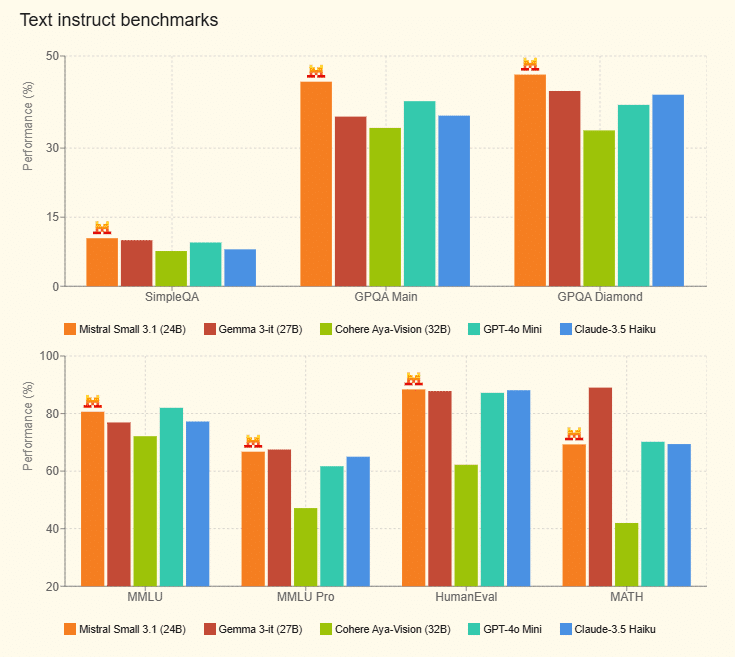 D’après les benchmarks internes de Mistral AI, ce modèle surpasse des concurrents directs comme Claude-3.5 Haiku et Gemma 3, avec un score de 81 % sur le MMLU, un indice de référence pour évaluer les capacités de raisonnement des LLMs. Ces résultats, bien que prometteurs, devront être confirmés par des tests indépendants.