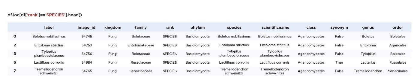 In the table 1, the `rank` column indicates the last taxonomic level reached in the mushroom identification in our data frame. Thus, if an entry has the value `KINGDOM` in the `rank` column, the `label` column value will be the most general identification, e.g., `Fungi.` The identified images can therefore belong to any mushroom.