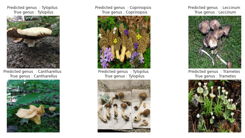The summary table below (table 5) shows the accuracy values for the three methods used. We also calculated the « top-k accuracy classification score » of the package sklearn.metrics (Pedregosa et al., 2011.) with k = 2 and 3 to assess how often the actual category falls between the two or three most likely categories. According to the results, EfficientNet would be the most suitable approach for our mushroom image classification problem with 80% and 86% accuracy.