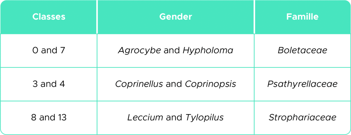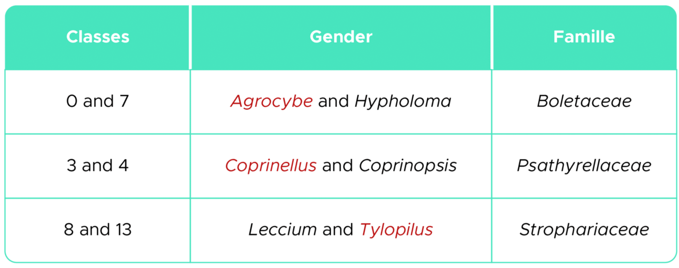 One reason for the confusion of classes may be that the taxonomic identification of mushrooms is wrong. The images we use come from a web page where users classify images of mushrooms only by looking at the images and according to their experience and not according to an objective taxonomic identification protocol.