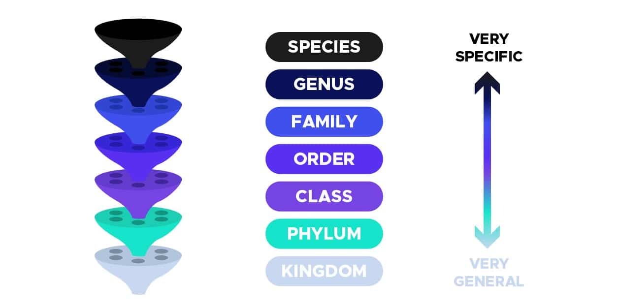 The first step in processing our data was to create a data frame with information about the images and taxonomy of the mushrooms. In biology, a taxonomy is a way of defining hierarchical groups based on common characteristics, as shown in the figure below :