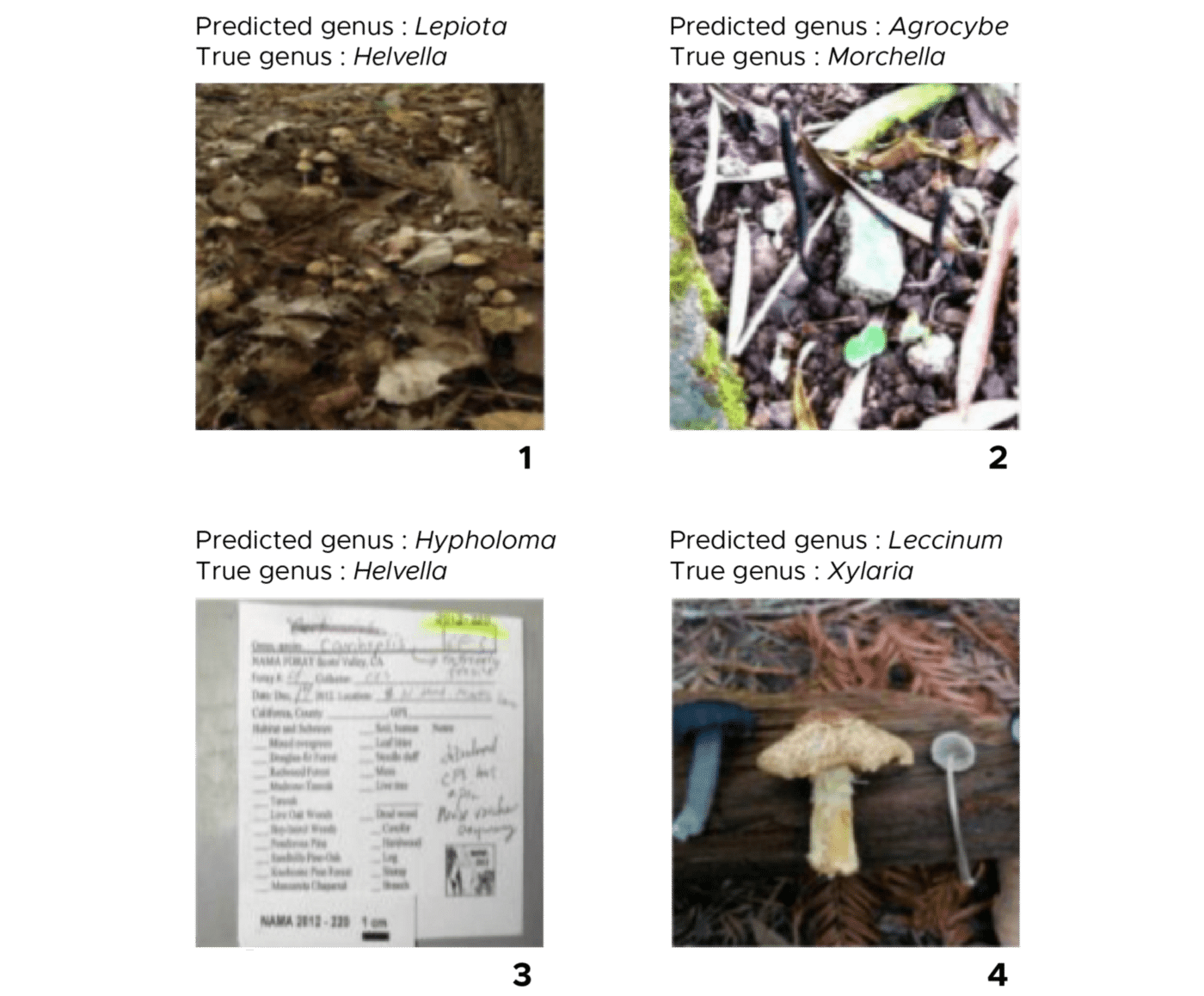 We have also noticed that the quality of the images is very diverse (Fig. 11). Indeed, some images contain elements that can prevent the model from identifying the mushroom correctly, such as images with a lot of noise around the mushroom to be classified (images 1 and 2). Images with no mushroom to classify (image 3). Images with more than one mushroom (image 4).
