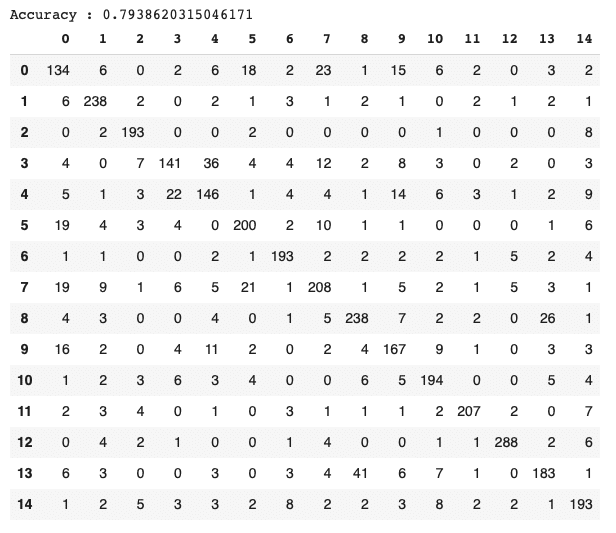 The confusion matrix (fig. 9) shows that classes 0, 3, and 8 tend to be classified as classes 7, 4, and 13, respectively :