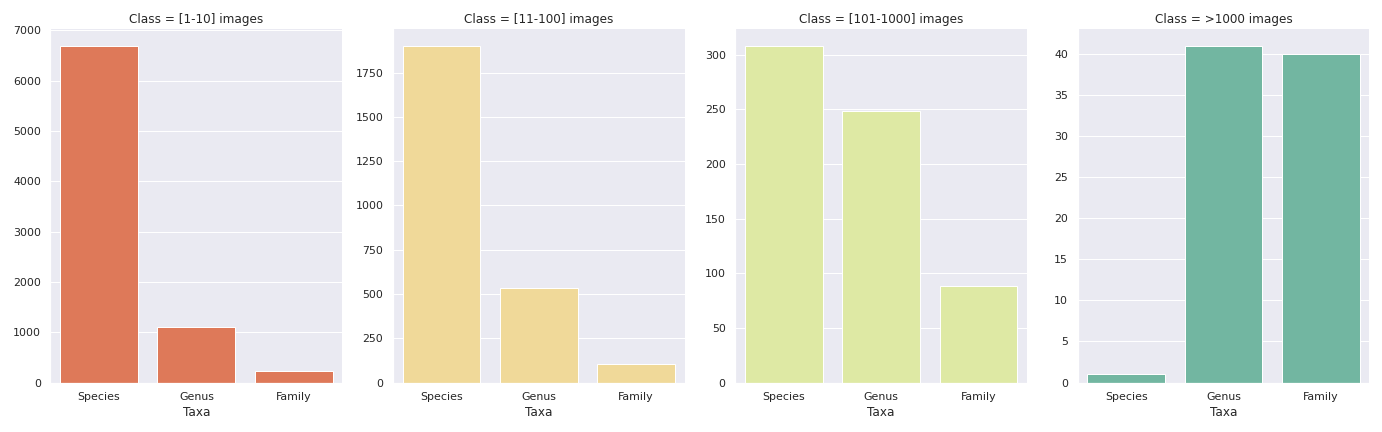 The image below (fig. 4) is a visualization of the distribution of the number of images in the taxa. Each of the four panels shows the number of labels (y-axis) for a given taxon (x-axis) represented by 1 to 10 images, 11 to 100 images, 101 to 1000 images, and over 1000 images.