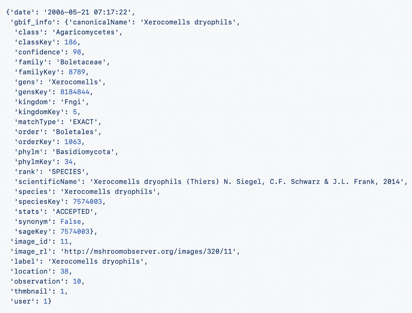 During our initial bibliographical research, we found that a previous project hosted on Github, « mushroomobser-dataset » had already explored this site to create a dataset of images dating from 2006 to 2016. Additionally, 12 JSON files contain additional information about each image.