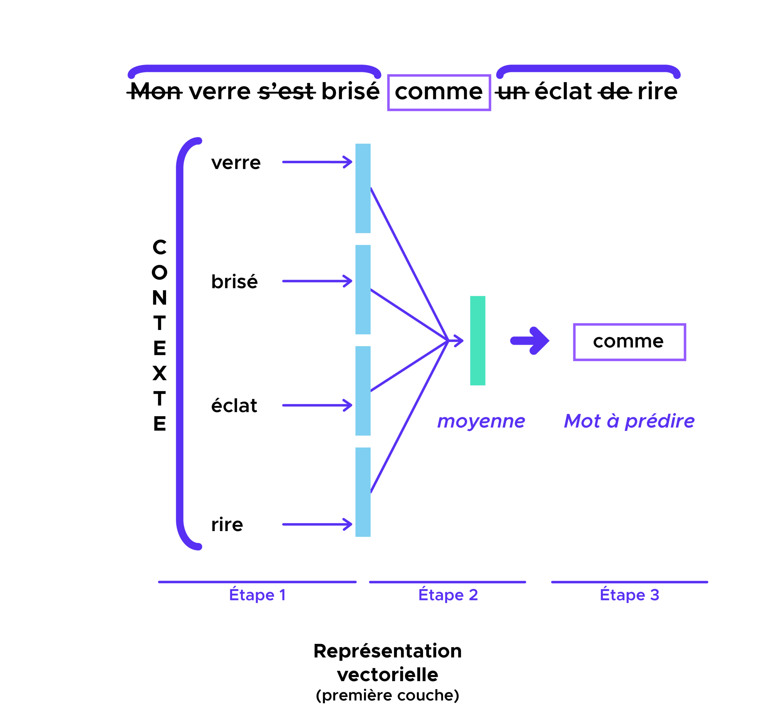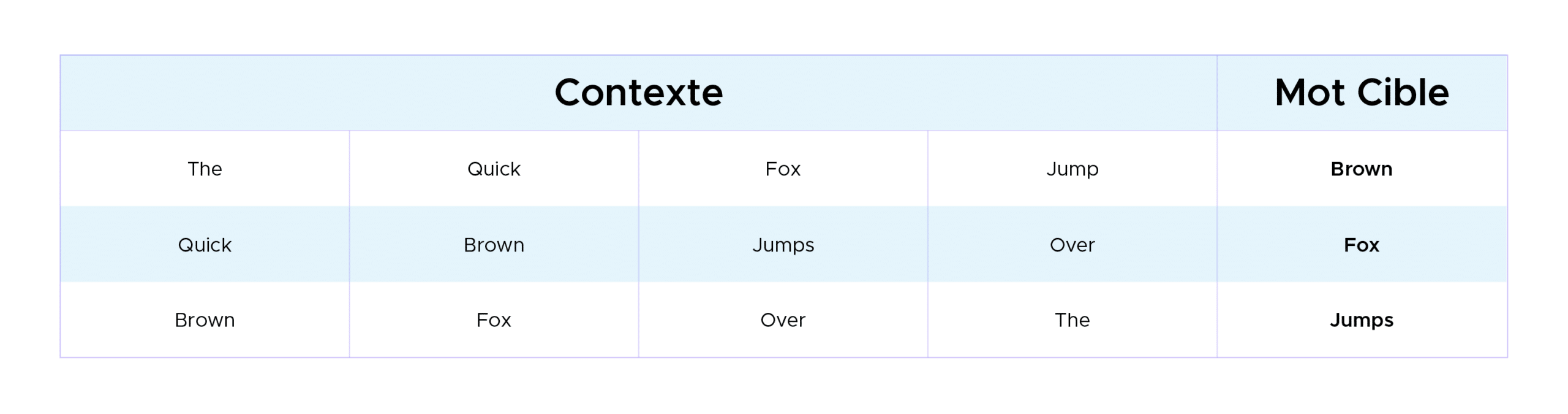 Dans l’image suivante, le mot dans la case bleu est appelé le mot cible et les mots dans les cases blanches sont appelés mots du contexte dans une fenêtre de taille 5.