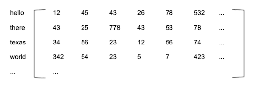 Finalement, une matrice d’embeddings n’est rien d’autre qu’une matrice contenant une grande variété de mots et leurs embeddings correspondants. Voici ci-dessous, un exemple de matrice d’embeddings anglais :